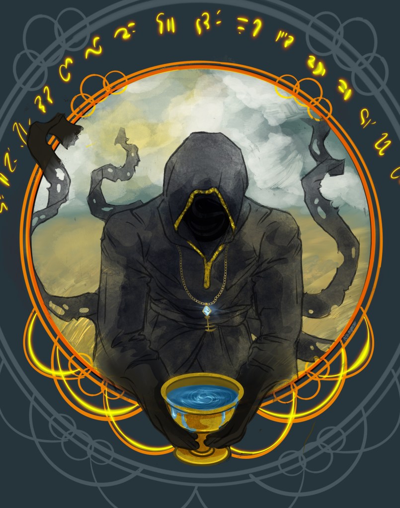 Rune takes the form of a robed figure. The robes he wears are a dark black with golden trim. The hood of his robes is always lifted around his face, and the only thing you see looking into it is a void. Darkness. Some of his followers have reported seeing Rune appear at the site of great battles, his form looming at the edge of the conflict, but never engaging.